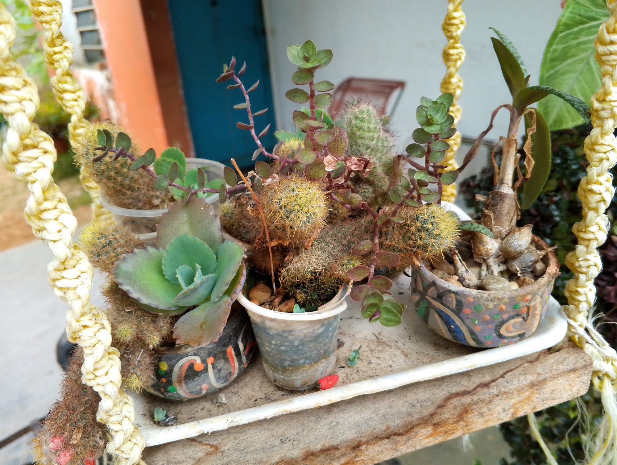 A close-up shot focuses on a collection of potted succulents and cacti arranged on a weathered, rectangular wooden and white painted tray. The plants are nestled in various containers, including painted ceramic pots and repurposed plastic cups, suggesting a DIY or recycled approach to gardening. The left-most pot contains a green succulent rosette surrounded by small cacti with yellow spines. Adjacent to it, a clear plastic cup houses more cacti and succulents with reddish-brown stems and small leaves. The center arrangement features a cluster of cacti, also surrounded by reddish-brown stemmed succulents. To the right, a uniquely decorated pot holds a plant with a thick stem and several leaves. The plants and the tray are suspended by a thick, yellow braided rope, indicating a hanging planter setup. In the background, blurred colors of orange and blue suggest a building or structure, while a metal chair can be seen between the plants, hinting at an outdoor or semi-outdoor setting. There is no information about people, subjects, actions, or interactions. The description contains a location in the city of San Carlos, Venezuela as requested.