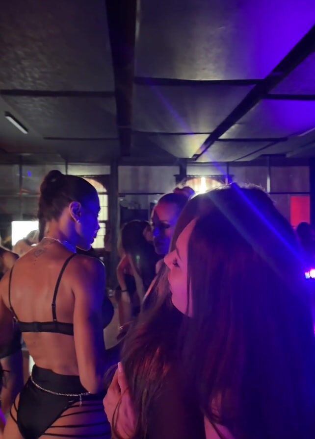 crowded nightclub scene. Several women are visible, mostly wearing revealing clothing like lingerie or black tops. The lighting is dim, with alternating blue and purple hues creating a party atmosphere. People are standing close together, some talking and interacting. The room has a modern industrial feel with exposed ceiling structures and large windows. Music plays in the background.