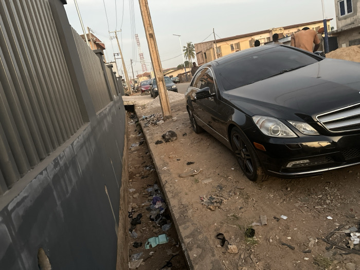 This image depicts a street scene in the city of Sardauna, Nigeria. In the immediate foreground on the left, a tall, dark gray corrugated metal fence or wall runs parallel to an open concrete drainage ditch filled with miscellaneous refuse including plastic bags and debris. To the right of the ditch, a black Mercedes-Benz E-Class Coupe (W207 generation) with tinted windows and black multi-spoke wheels is parked on an unpaved, dirt shoulder heavily littered with trash. In the mid-ground, behind the Mercedes, two shirtless individuals are visible. One individual, seen from behind, stands near a pile of light-colored sand or construction material. Another partially visible figure is further left. The background reveals a dirt road extending into the distance, lined with various buildings, some appearing older or in a state of construction. Overhead utility poles with numerous wires are prominent, and a red and white lattice telecommunications tower stands in the far background. The sky is bright with a slight haze. No explicit actions or interactions are discernible.