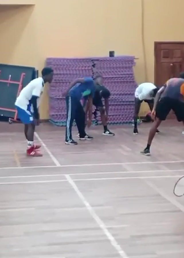 In a well-lit indoor gymnasium with a hardwood floor, a group of seven people are present