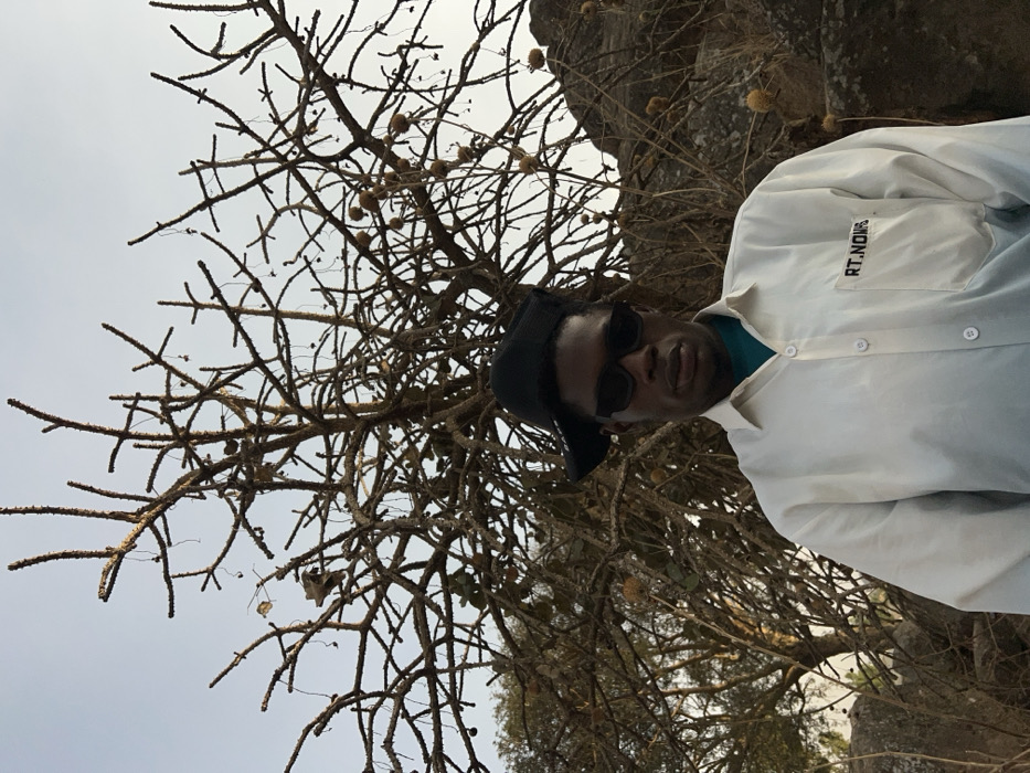 A male individual is depicted standing outdoors in Bukuru, Nigeria. He is positioned centrally, facing directly towards the camera. The individual has dark skin and is wearing a black backward-facing cap, dark rectangular sunglasses, and a light-colored (off-white or light beige) long-sleeved button-up shirt. A dark teal collar or undershirt is visible beneath the main shirt. The left chest pocket of the shirt displays the embroidered text "RT.NOWS" in black. Behind the individual, a large, leafless tree or shrub occupies the majority of the background. Its numerous, gnarled, and rough-textured branches extend across the frame, with several small, spherical, light-colored seed pods or dried fruits hanging from them. To the right of the tree, rocky outcrops and boulders are visible, suggesting a dry, rocky terrain. The sky above is a uniform light blue or grey, indicating clear daylight conditions. No other individuals are present, and no specific actions or interactions are discernible.
