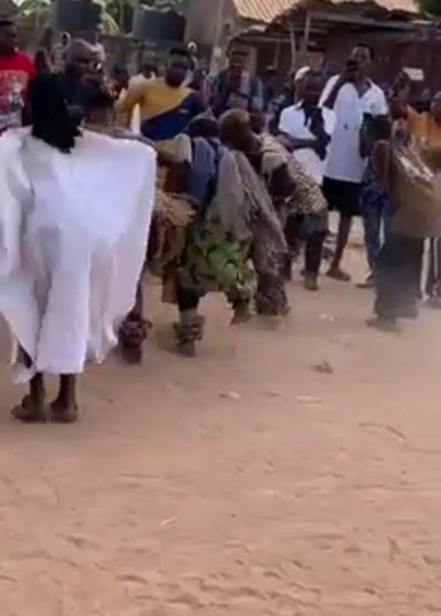 A group of people gathered on a dirt road watch three performers dance. The performers wear garments made of fabric and dried vegetation that obscures their forms. They also appear to wear rattles on their feet. The person opposite them wears a white robe. One dancer bows low to the ground. All the spectators are dressed casually. The location appears to be a village. Small, one story buildings are in the background and a water tank towers on a utility pole. The weather is warm and sunny. Many of the spectators are recording the performance with their cell phones.