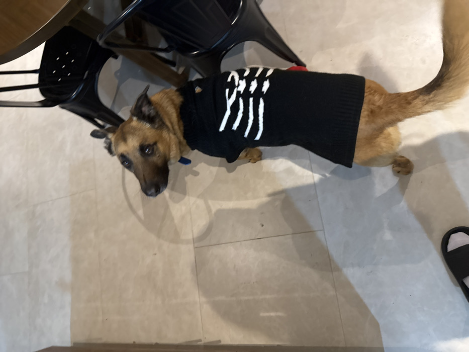 - "A brown and black dog wearing a black sweater with a white skeleton design stands on a tile floor next to a black metal chair" by FM-Gswv13, licensed under CC BY 4.0
