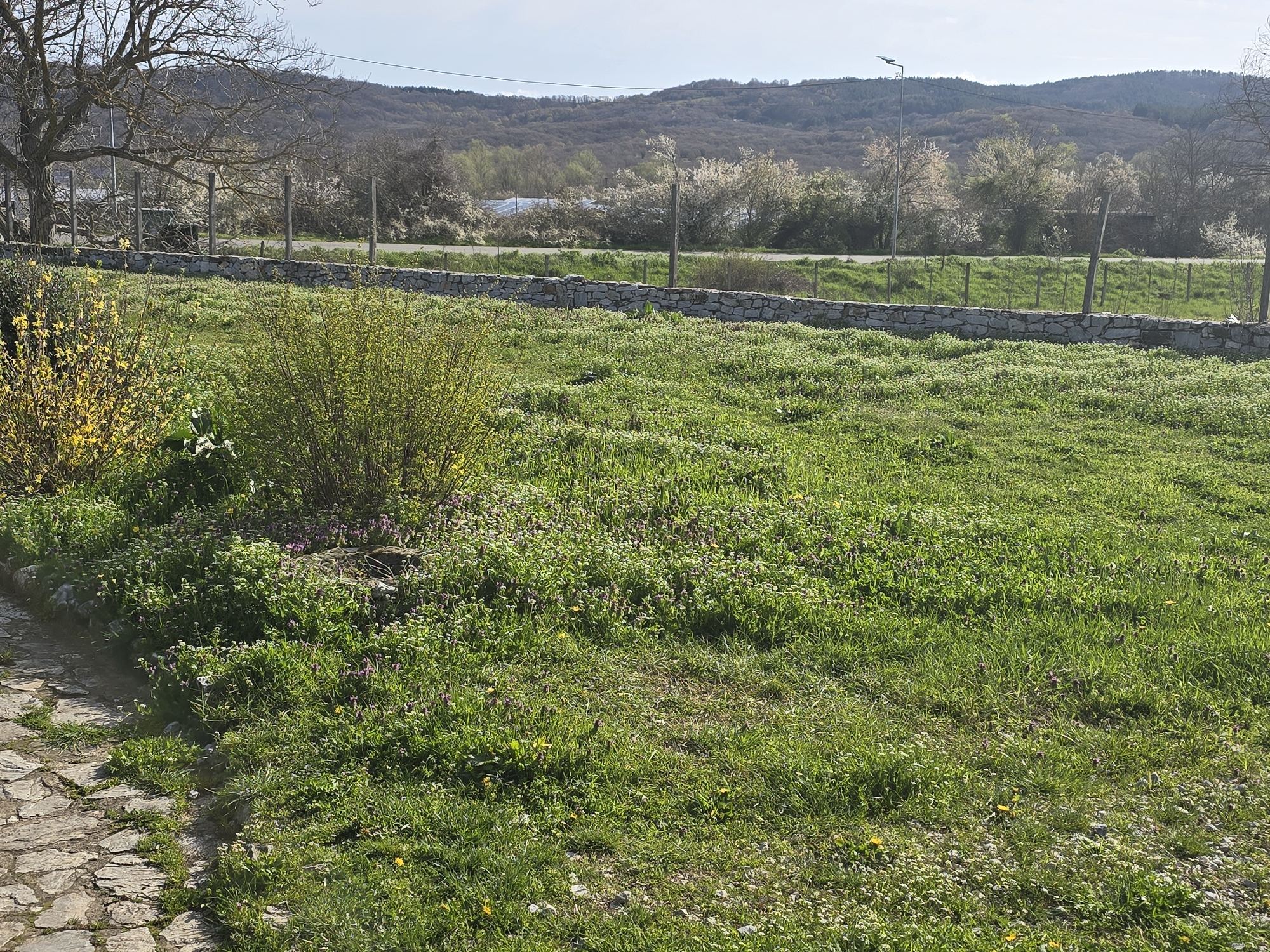 The scene is an outdoor grassy area with a stone walkway on the left and a low stone wall running horizontally across the middle distance. Behind the wall, a road is visible, and beyond that, a landscape of trees and hills under a slightly hazy sky. The foreground grass is interspersed with small purple and white flowers. To the left of the frame, there are bushes with yellow flowers. A large tree stands to the far left. Thin wooden posts are spaced along the wall. Based on the surroundings, the location is likely in a rural or semi-rural area near Malko Tarnovo, Bulgaria. No people are visible in the image.