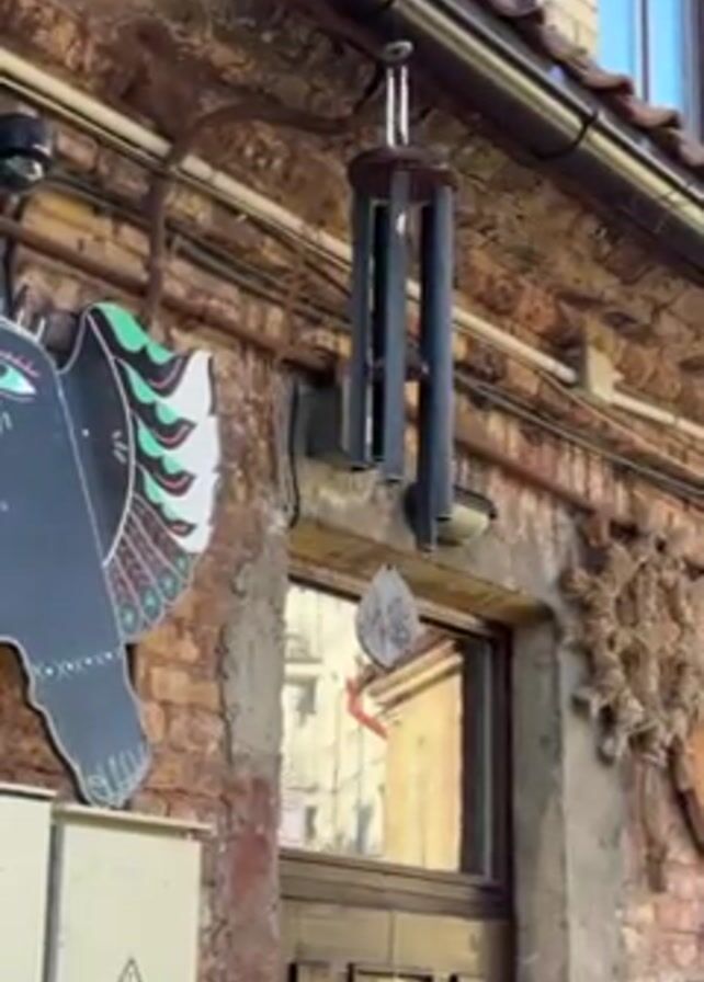 close-up of a wind chime hanging outside a brick building. The wind chime has four dark-colored cylindrical tubes. To the left is a dark-colored sign with a bird-like figure on it. There is a window and a doorway visible behind the wind chime. The building appears to be old, with weathered bricks and visible wiring. The sky is visible in the background. The wind chime is gently swaying and making a sound.