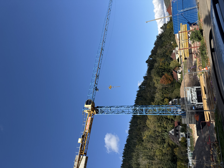 This image depicts a construction site located in Châtenois, France, on a clear, sunny day. A prominent, operational tower crane, primarily blue with a yellow jib section featuring the "G. Schreiber" logo, dominates the central frame, extending horizontally across the sky. Its hook assembly hangs idly. Below the crane, the construction site is active, showing an excavated area with exposed soil and rebar for foundations. Piles of aggregates, stacked wooden formwork, and other construction materials are visible. An orange safety cone is positioned on the ground. Blue temporary fencing or large blue containers are situated on the right side of the site. In the far right background, a portion of a smaller, lighter-colored crane or utility pole is visible. The background features a steep, densely forested hill with predominantly green trees, interspersed with patches of orange and brown autumn foliage. Several houses, some exhibiting traditional half-timbered architecture, are nestled at the base and on the lower slopes of the hill. The sky is bright blue with a few sparse white clouds. The very bottom of the frame shows the dark top of what appears to be a vehicle's hood. No individuals are visible in the scene.