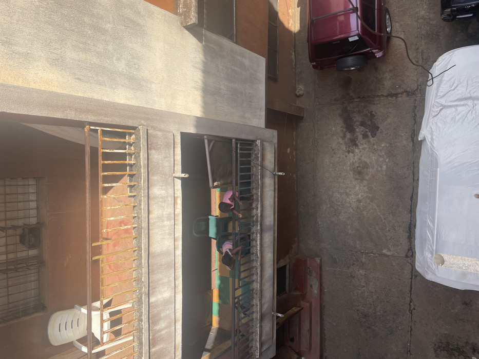 The image depicts an exterior view of a multi-story building in Nkpor, Nigeria, captured from an elevated perspective looking downwards. On the uppermost visible balcony, a white plastic chair rests near a rusted metal railing. Above this, a window secured with metal bars is visible. Below, on a second-story balcony, two individuals, likely children, are observed. One child, wearing a striped shirt, leans over the dark metal railing, looking downwards. Beside them, another child in a pink shirt also leans over the railing, focused on the ground level below. Behind them, a dark plastic chair is positioned on a multi-colored mat featuring green, orange, and black patterns. A white cable or line extends downwards from this balcony. The ground level is a concrete surface, displaying cracks and dark stains. A large object, covered with a translucent white plastic sheet, occupies the foreground. A pipe or pole is partially visible near the left edge of this covered object. To the right, a maroon vehicle, possibly an SUV, is parked, displaying a spare tire mounted on its rear. A dark cable extends from the rear of this maroon vehicle towards the covered object in the foreground. Strong shadows are cast across the scene, indicating bright daylight.