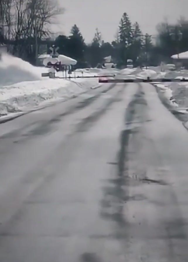snow-covered road leading towards a railway crossing with flashing red lights and a lowered barrier. A large amount of snow is being thrown up in the air, apparently by a snowplow or a passing train. A person in the video yells in surprise, followed by sounds indicating an apparent collision of vehicles. The landscape is generally white with snow covering the ground and visible trees in the background.