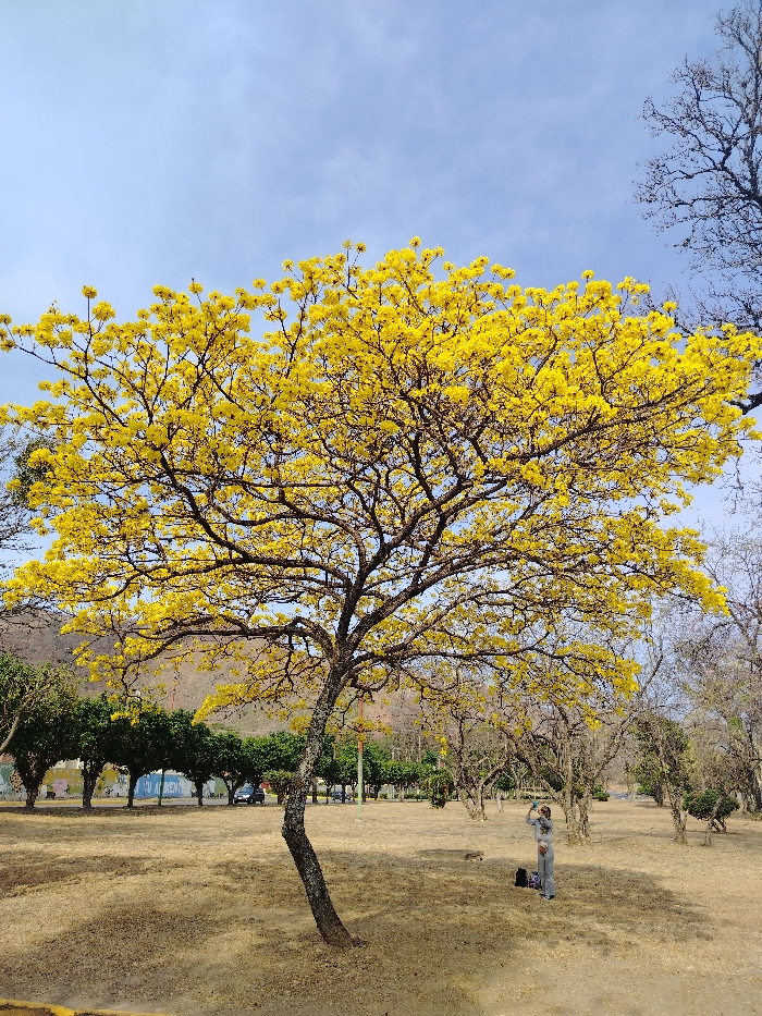 A vibrant yellow-flowered tree dominates the scene in a park-like setting under a clear blue sky. The tree's branches are adorned with numerous bright yellow blossoms. Dry, grassy ground stretches beneath the tree, creating a warm, earthy contrast to the vibrant yellow. In the background, other trees line the landscape, and a person stands taking a photo.