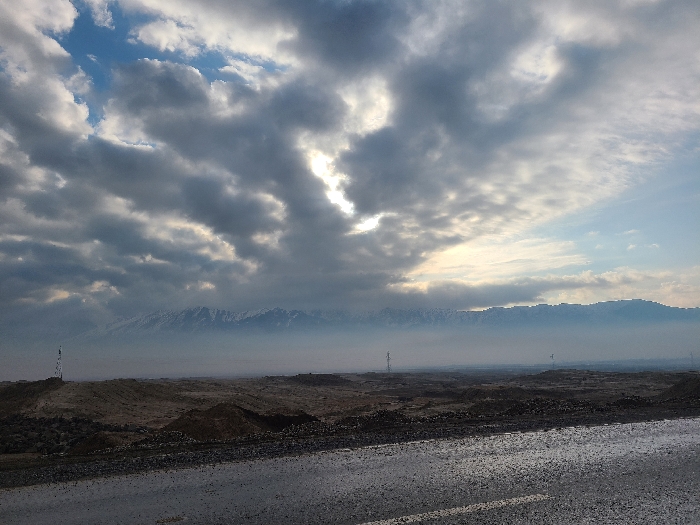 An expansive sky dominated by heavy, gray clouds with glimpses of blue and the sun attempting to break through. In the distance, a range of snow-capped mountains is barely visible through the haze. The foreground features a rugged, desolate landscape with scattered mounds of earth and dark, rocky terrain. A wet, asphalt road stretches across the bottom of the image, reflecting the light from the sky. Three transmission towers stand as sentinels in the barren landscape.