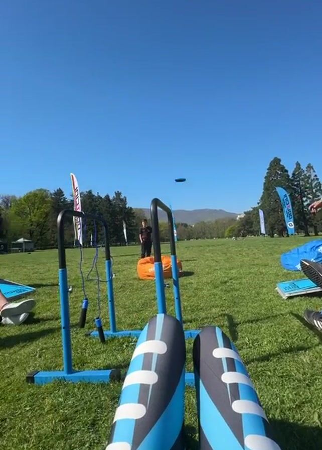 The camera starts with a low angle, showing a person’s legs in blue and gray tights, sitting on the grass in a park. There are exercise bars in front of them. The camera pans up and around, showing a sunny day, with green grass, trees, and other people relaxing on beanbag chairs. There are advertising flags and an inflatable Powerade bottle. A large Connect Four game is on the grass. A white van is parked nearby.