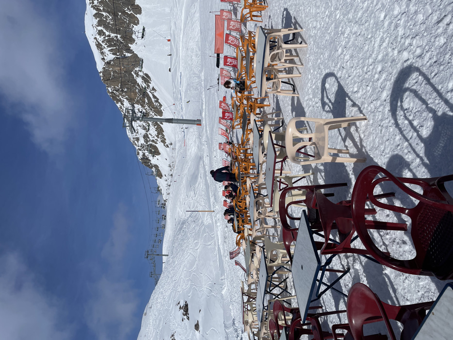 This image depicts an outdoor restaurant or café situated on a snow-covered mountain at a ski resort in Puy-Saint-André, France, under a clear blue sky with sparse clouds. In the foreground and mid-ground, numerous outdoor tables with light grey tops and various colored bases (dark blue, white, red) are arranged on the snow. Accompanying these are numerous plastic chairs in shades of dark red, orange, and beige. A section of the mid-ground features several red sun loungers, some displaying "Coca-Cola" branding. Approximately ten to fifteen individuals are visible in the mid-ground, seated at tables or on loungers. One person in a dark jacket stands with their back to the viewer near a table, while another in a light blue jacket is seated at a different table. Several other individuals are less distinctly visible due to distance and focus. In the background, snow-covered mountain slopes rise, displaying numerous ski tracks. A ski lift system, comprising multiple towers and attached chairs, traverses the slopes. Rocky outcrops are visible on the higher parts of the mountains to the right. The scene is brightly lit by natural sunlight, casting distinct, elongated shadows from the tables and chairs onto the snow. An orange banner or netting is visible in the mid-right background.