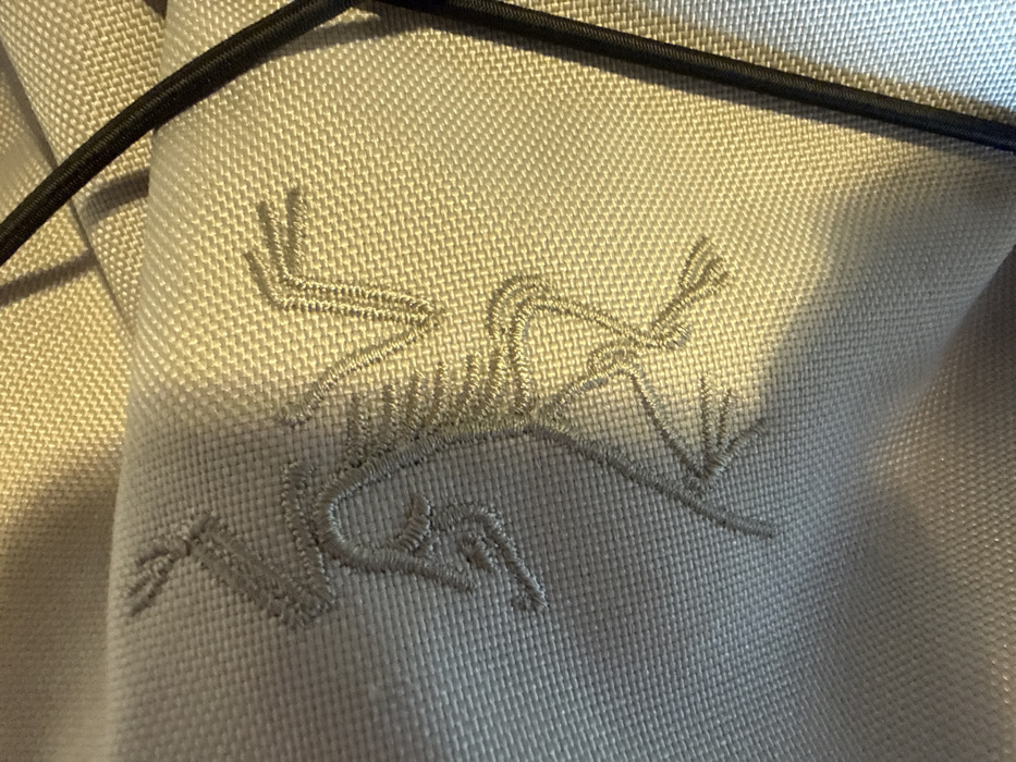 The image presents a close-up view of a light-colored, possibly beige or off-white, woven fabric. Centrally featured is an embroidered logo, executed in light grey thread, depicting the stylized skeletal form of an Archaeopteryx in a dynamic, upright pose, facing left. The embroidery shows clear thread detail outlining the creature's head, wings, body, and limbs, with individual stitches visible. The fabric exhibits a coarse, visible weave pattern and is subtly folded, creating texture and shadow across its surface. A thin, black, braided cord runs vertically along the right edge of the frame, partially visible. Lighting suggests an indoor setting with diffused illumination, casting soft shadows that highlight the textile's texture and the embroidery's relief. No specific geographical markers or environmental context are present within the visual frame to indicate a location such as Herzliya, Israel.