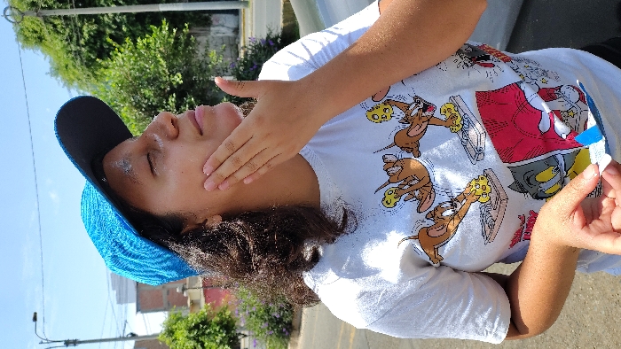 An individual is depicted outdoors in Chorrillos, Peru, on a clear, sunny day. The person, appearing to be female, has dark, curly hair and is wearing a blue baseball cap and a white t-shirt featuring "Tom and Jerry" cartoon characters. Their right hand is shown applying a white substance, consistent with sunscreen, to the right side of their face, specifically across the forehead, nose, and cheek. The eyes are closed, and the head is tilted upwards. The left hand holds a small, partially opened sachet or packet, which appears to be the source of the applied substance, showing blue and white packaging elements. The background includes green foliage from trees and bushes, a paved road or sidewalk edge, and various urban structures: utility poles with wires, and buildings constructed with brick and lighter-colored materials. A light-colored vehicle is partially visible behind the individual on the right side of the frame.