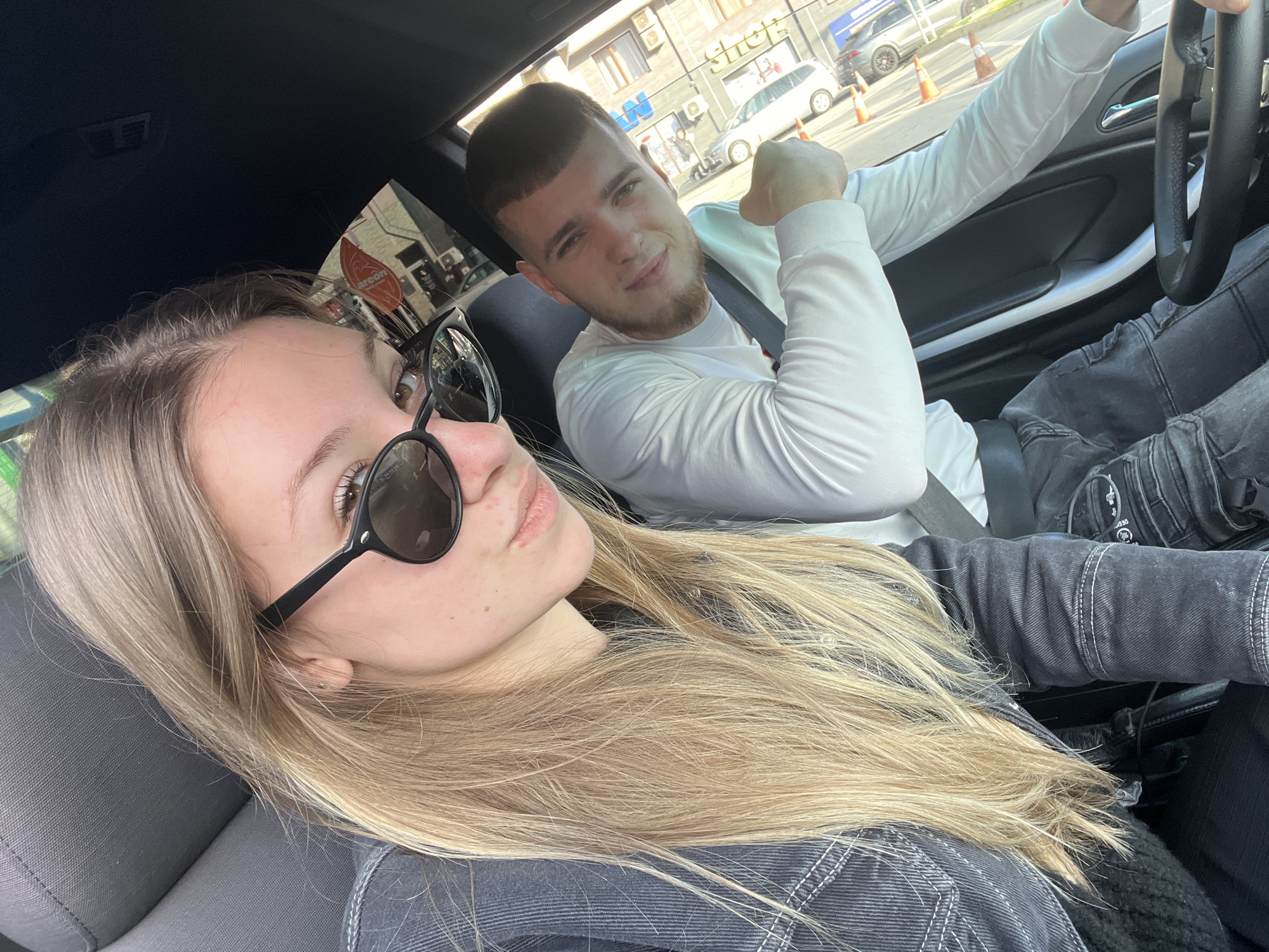 A selfie-style image depicts two individuals inside a vehicle, likely located on ul. "Dr. Pirgov" 3, 9000 Varna Center, Varna, Bulgaria, facing an urban street scene during daylight hours. In the foreground, a female with long, straight blonde hair and light skin occupies the passenger seat. She wears dark-framed oval sunglasses with dark lenses, a dark denim jacket with white stitching, and a dark shirt underneath. Her visible right eye is brown, and small reddish spots are present on her cheek/nose area. She is holding the camera for the selfie. In the mid-ground, to the right and slightly behind the female, a male occupies the driver's seat. He has short, dark hair with a fade haircut and a light beard. He wears a white long-sleeved shirt, dark pants, and a seatbelt across his chest. He is smiling and giving a thumbs-up gesture with his right hand, while his left hand is presumably on the steering wheel, partially visible at the bottom right. The vehicle's interior features dark grey or black upholstery on the seats and ceiling. Through the car's window on the right side, an urban street environment is visible. Multiple multi-story buildings line the street. A prominent red sign with white text, clearly displaying "AREON" with a stylized 'A', is affixed to one of the buildings. Another blue sign with white text, possibly "SHOP", is visible above a white car. Other vehicles, including a dark car, and several orange traffic cones are present on the street. The scene is brightly lit by sunlight.