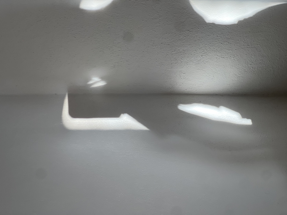 room corner where the wall meets the ceiling. The surfaces are light gray and appear to be painted. Reflected light patterns are cast onto the ceiling and wall. These patterns are irregular and bright, suggesting sunlight filtered through an object such as leaves or blinds. The ceiling has a slight texture compared to the smooth wall.