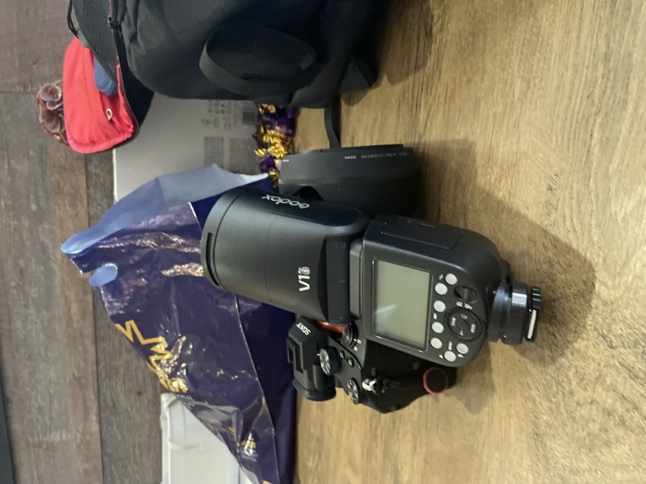 This image captures an indoor scene in Svilengrad, Bulgaria, featuring photographic equipment and miscellaneous items on a wooden floor. A black Sony mirrorless camera is positioned centrally on the light brown wooden floor, with a black Godox V1S speedlight flash unit mounted securely on its hot shoe. The flash's rear control panel and LCD screen are visible, oriented towards the viewer. The flash head is angled slightly upwards and to the left. In the background, behind the camera and flash, a crumpled purple plastic bag with a yellow, star-like design is visible, resting against a white rectangular object or container. To the right of the purple bag and behind the flash, a cluster of small, crinkled golden and purple foil objects is present. Further to the right, a red fabric item, possibly a pouch or part of a bag, holds a small blue object. A dark-colored fabric backpack is partially visible on the far right of the frame. The background wall consists of a light-colored, possibly white, lower section, topped by horizontal wooden paneling. All items are stationary; no actions or interactions are currently occurring.