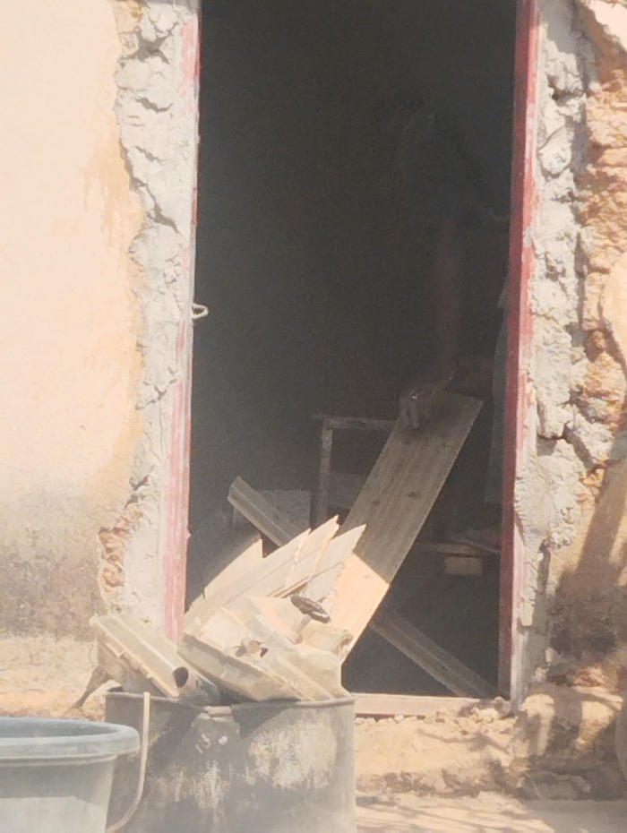 The image depicts a damaged doorway leading into a dark interior space in Idon, Nigeria