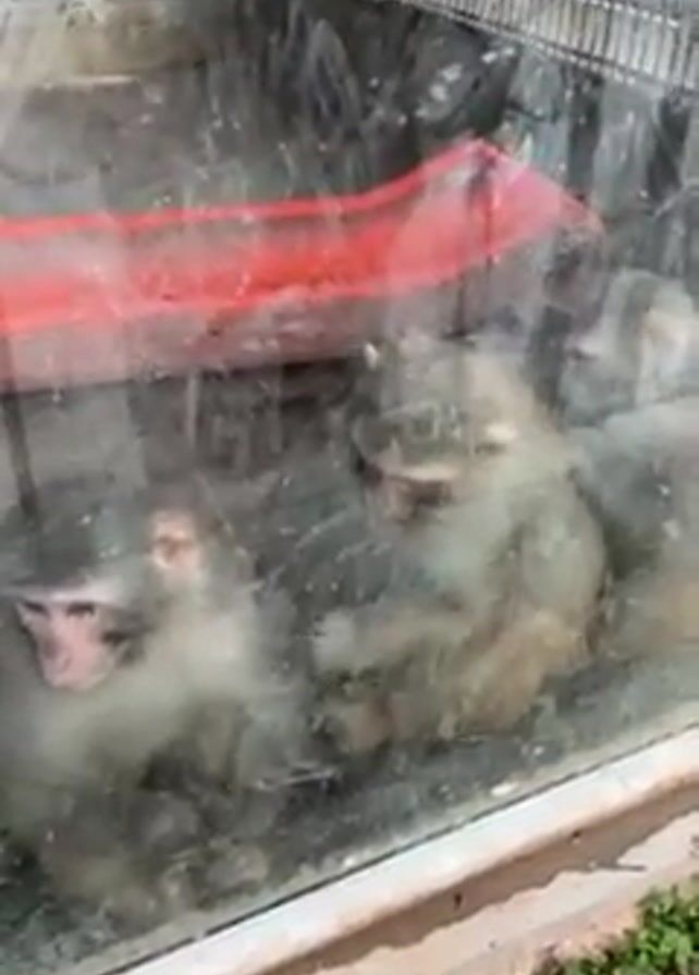 three macaques sitting behind a foggy glass enclosure. The primates have light grey fur and reddish faces. A red feeding trough is in the upper left corner of the enclosure. The macaques appear inactive. The glass is smudged and dirty. The outdoor area surrounding the enclosure has some greenery and concrete.