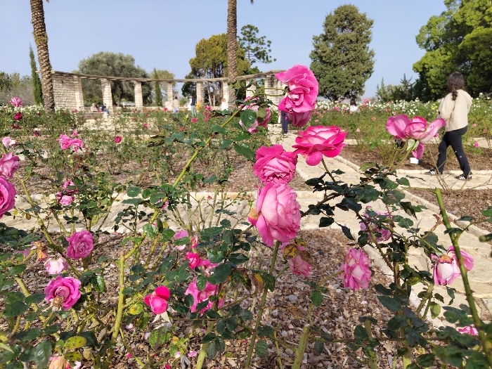 The image depicts a rose garden in Zikhron Yaakov, Israel