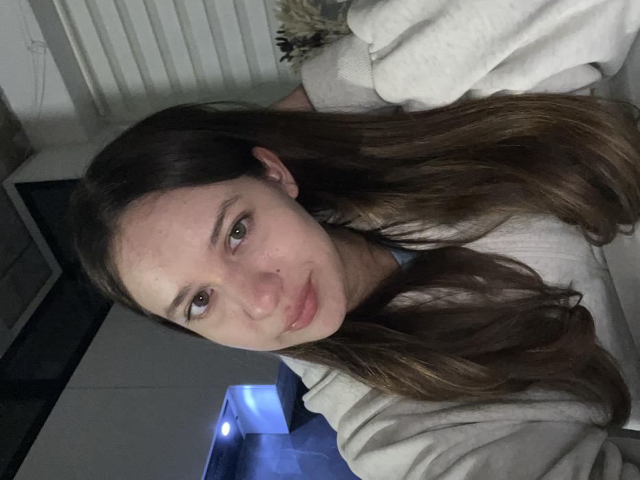 The image displays a single female individual in an indoor setting. She is positioned centrally, facing directly towards the camera. Her hair is long, dark brown, and parted on the left, extending over her shoulders. Her complexion is fair, with minor blemishes visible on her forehead and nose. Her eyes are light brown or hazel, and her lips are full and appear slightly glossy. She is wearing a light gray or off-white hooded garment, possibly a sweatshirt, with a light blue garment visible underneath. Her left arm appears raised, with the hand positioned behind her head or neck, indicated by the gathered fabric of the sleeve. The background is dimly lit. To the upper left, a dark, angled structure is visible, featuring a recessed fixture emitting a bright blue light. To the right, a section of horizontal light-colored blinds is present, and below them, a decorative arrangement of dried, light-colored plants is discernible. No visual elements within the image confirm its location as Ketoshi, Russia.