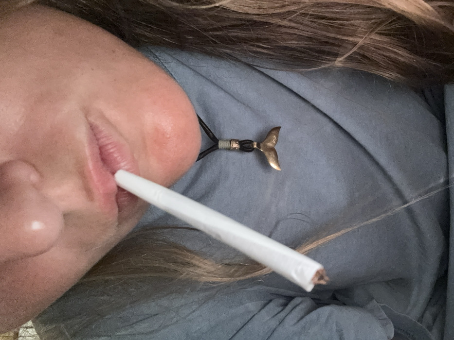 The image depicts a close-up, chest-up view of an individual in General Luna, Philippines. The subject, a person with fair skin and visible long, light brown hair on the right side of the frame, is wearing a light blue or teal long-sleeved top. They are holding a white, hand-rolled item, consistent with a cigarette or a cannabis joint, between their lips. The visible end of the rolled item contains a brown, fibrous substance. Around the individual's neck, a dark cord necklace is worn, featuring a central dark bead flanked by two lighter beads, and a metallic whale tail pendant of bronze or gold tone. The background is indistinct and out of focus, providing no specific environmental details.