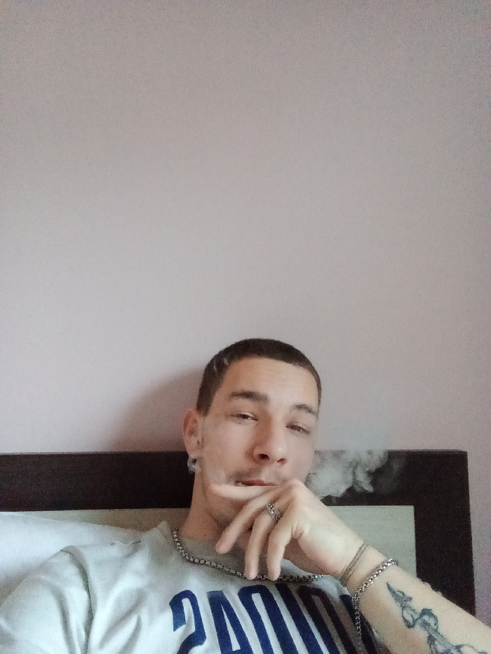 An indoor scene depicts a male individual, appearing to be in his late teens or twenties, seated or reclining. He has short, dark hair, light skin, and is looking directly at the camera. He wears a light-colored t-shirt with partially visible dark blue lettering, a silver-colored chain necklace, a silver-colored ring on his left ring finger, and a silver-colored bracelet on his left wrist. A tattoo is visible on his left forearm. His left hand is raised towards his mouth, from which a plume of white smoke is exhaling towards the right side of the frame. The background consists of a plain light pink wall above a dark brown headboard, with a white pillow or sheet partially visible on the left. The scene is consistent with a private residence. No specific landmarks or architectural features are present in the image to identify a precise location within the city of Pazardzhik, Bulgaria.