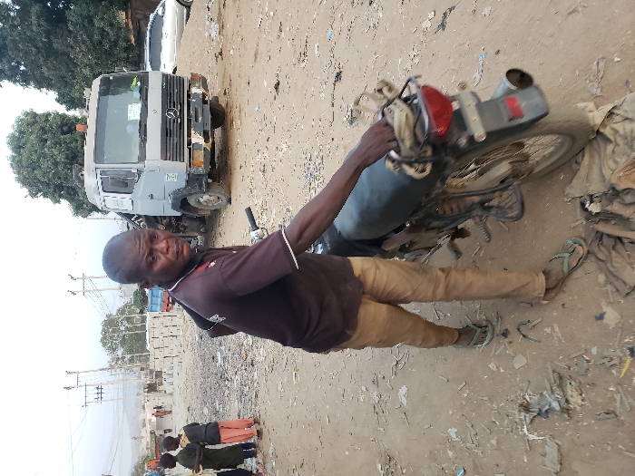 A man stands next to a motorcycle, possibly interacting with it. He wears a brown shirt and khaki pants with sandals. In the background is a large, pale gray Mercedes-Benz truck. The surrounding area is dusty and littered with trash. Other people are visible at the bottom of the frame. The photograph is somewhat tilted.