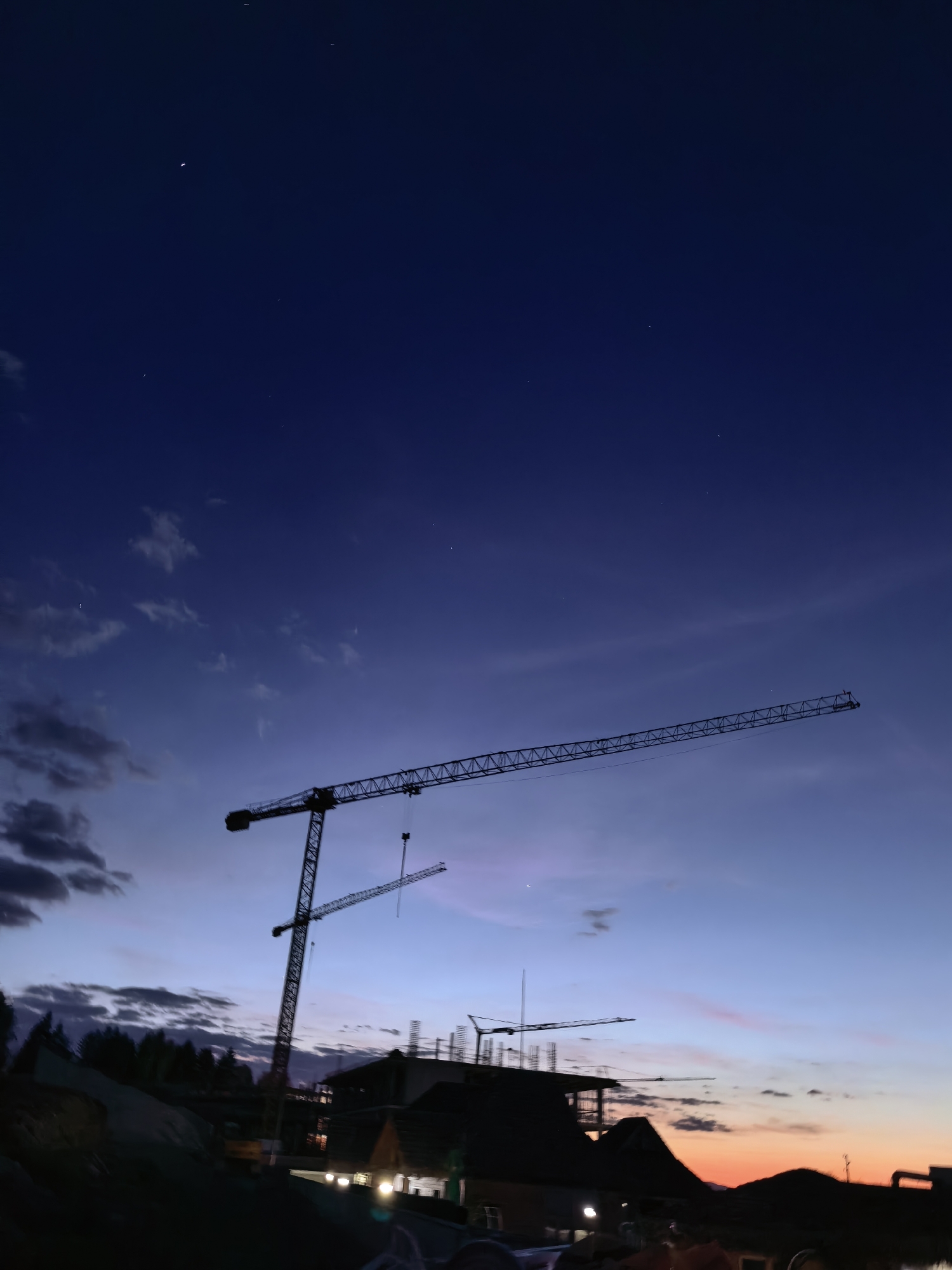 The image depicts a construction site at dusk in Sapareva Banya, Bulgaria. Three cranes are silhouetted against a dark blue sky, which fades to orange near the horizon. Construction is underway on a building, with framing and scaffolding visible. Lights are on within the building. There are trees in the lower left. The sky is partially cloudy. The photo appears to be taken at ground level.