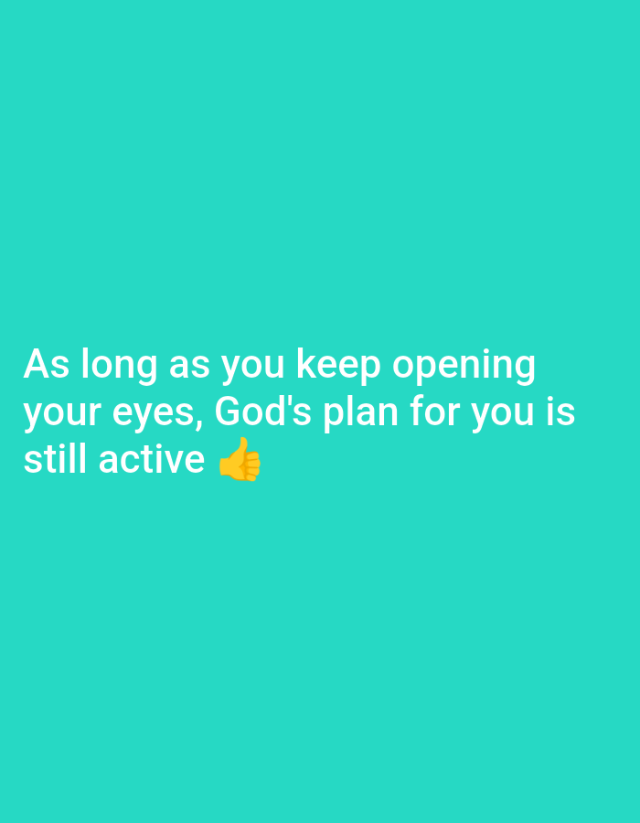 This digital graphic, located in Festac Town, Nigeria, displays white text against a solid teal background. The text, positioned in the upper-middle section and centrally aligned, reads: "As long as you keep opening your eyes, God's plan for you is still active". Immediately following the word "active" is a yellow thumbs-up emoji (👍). No other discernible subjects, objects, people, or environmental features are present within the frame.