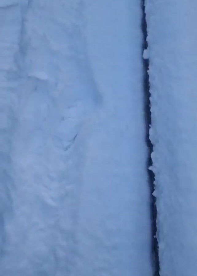 person walking on a snow-covered road, the road having tracks of cars on it. The person is wearing gloves and snow boots. There is a fence on the left side of the road and houses on both sides. The sky is blue with some clouds. The camera pans up to reveal the snow-covered landscape and houses. The video appears to have been taken in a residential area. The person speaking in Russian mentions the presence of a lot of snow.