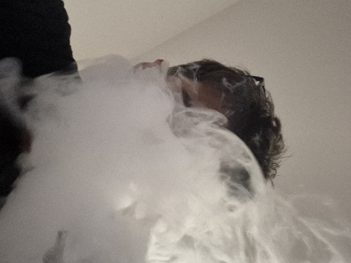 A person is depicted from a low-angle perspective, positioned indoors within the city of Bragança, Portugal. The individual's head and upper torso are visible, with dark, wavy hair and a dark-colored garment on their upper body. A significant volume of dense, white smoke or vapor is present, largely obscuring the person's face and emanating from their mouth area. A small reddish detail is discernible near the center of the smoke cloud, corresponding to the facial region. The background is a plain, light-colored surface, consistent with an interior wall or ceiling.