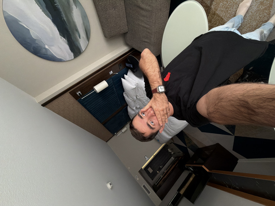 The scene depicts an interior view of a contemporary hotel room located in Vienna, Austria. An adult male, with short dark hair and light skin, is positioned in the foreground, facing the camera with wide, open eyes. His right hand is placed over his mouth, covering his lips and nose, suggesting a gesture of surprise or silence. He is wearing a black short-sleeved t-shirt with a small red embroidered emblem on the left chest, and light blue jeans. A silver-toned watch with a rectangular face and a dark band is visible on his right wrist. Behind the individual, a large bed with white linens and multiple pillows is prominently featured. The bed has a dark blue upholstered headboard with vertical ribbing, flanked by two wall-mounted light fixtures with cylindrical shades. To the immediate right of the bed, a section of a grey upholstered sofa is visible, along with a small, round, light-colored table. Above the sofa, a circular piece of abstract wall art, characterized by brushstrokes in white, light blue, and dark blue/green tones, is mounted on a light-colored wall. The floor of the room is covered with a patterned carpet featuring geometric designs in beige, brown, and dark blue shades. The white ceiling contains a circular smoke detector. In the background, a dark doorway leads into an adjacent area, likely an entryway, where dark furniture and a rectangular ventilation grille are discernible. The overall image is captured from an oblique, tilted perspective.