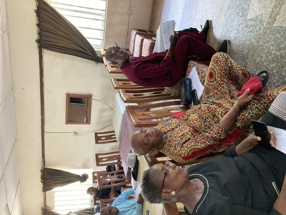 The image depicts an indoor gathering of at least six mature to older adults within a room in Umuahia, Nigeria
