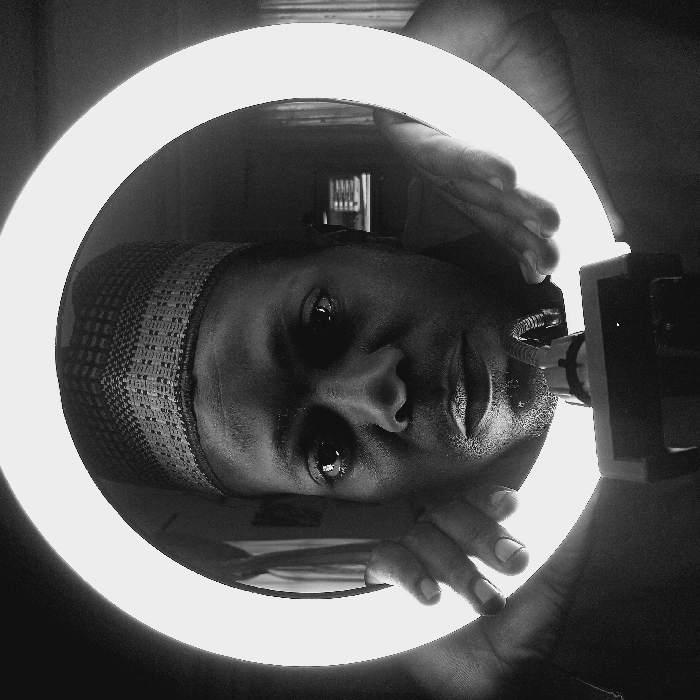 The image depicts a close-up, black and white portrait of an adult male in an indoor setting within Sabon Tasha, Nigeria. The man's face, positioned centrally, is framed by a brightly illuminated circular ring light. He wears a dark, patterned cap. His eyes are open, looking directly forward. His hands are visible on either side of his head, with fingers spread, appearing to interact with or hold the ring light. Below his chin, at the bottom center of the ring light, a dark mounting device, likely for a camera or phone, is visible with a coiled cable extending upwards. The background behind the man is dark and out of focus, with a faint rectangular object with horizontal lines discernible on the viewer's right side, consistent with a dimly lit interior.