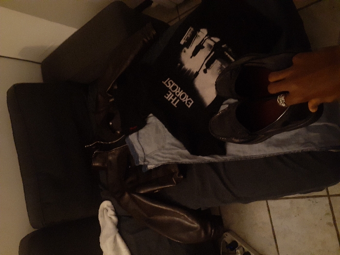 The image depicts an indoor scene in Milan, Italy, showcasing an arrangement of clothing and accessories. A dark-colored sofa serves as the primary surface. Draped over the sofa's back and seat is a dark brown leather jacket. To its left, a white folded towel or fabric item rests on the armrest. Beneath the jacket, a pair of light blue jeans are laid out, partially obscured. A black t-shirt, emblazoned with "THE EXORCIST" in white text above a corresponding graphic (a silhouetted figure), lies in front of the jeans. A pair of dark, possibly black patent leather, slip-on shoes or loafers are positioned in front of the t-shirt. A dark-skinned human hand, adorned with a prominent multi-faceted ring on one finger, is seen holding one of these shoes. The floor consists of light-colored square tiles with dark grout lines. In the lower-left, a portion of a light-colored tray containing indistinct items is visible on the floor. The lighting in the scene is dim.