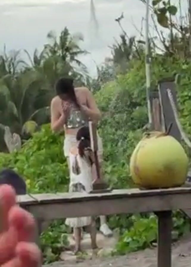 A mother and child are rinsing off in an outdoor shower at a beach. The mother is wearing a shiny top and skirt, and the child is in a dress. They are both standing under the shower, which is a simple pipe structure with a showerhead. The beach has dark sand, and there are palm trees and other greenery in the background. There is a wooden table next to the shower with a large green coconut on it. Another person is in the foreground, looking at the mother and child. The sky is overcast.