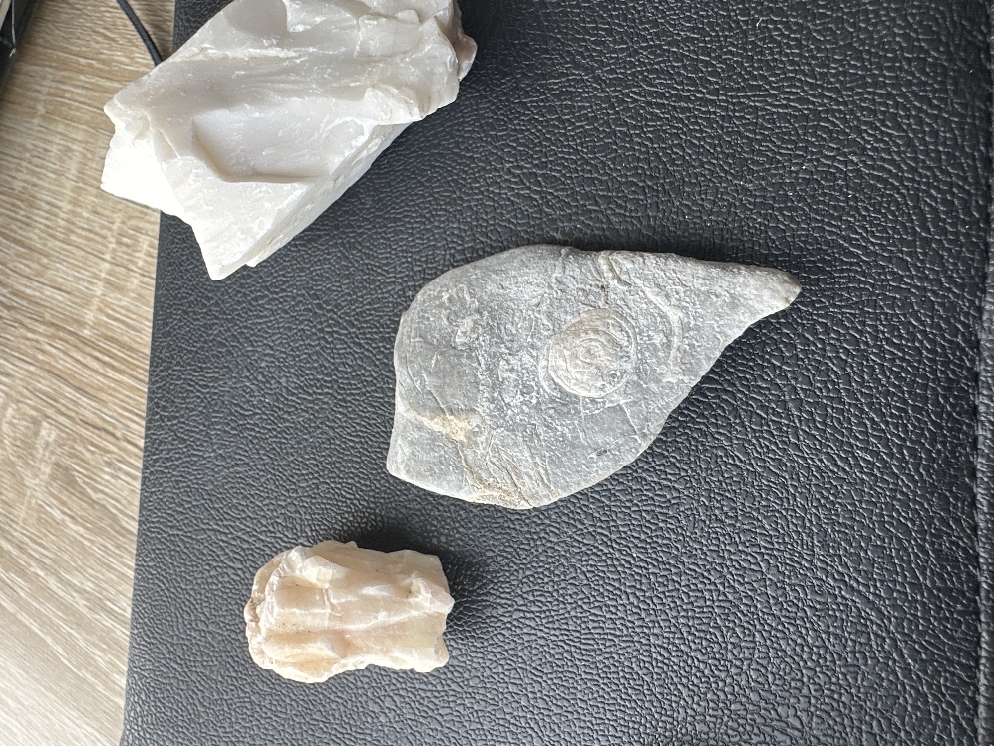 three rocks on a textured dark gray surface. The rock in the upper left is white and angular. The rock in the center is gray and has a fossil embedded in it. The rock in the lower left is a small, off-white piece. The surface they are on is a dark, textured material, possibly a notebook cover. The background shows a light wood surface. There is no indication of this being taken in Mexico City.