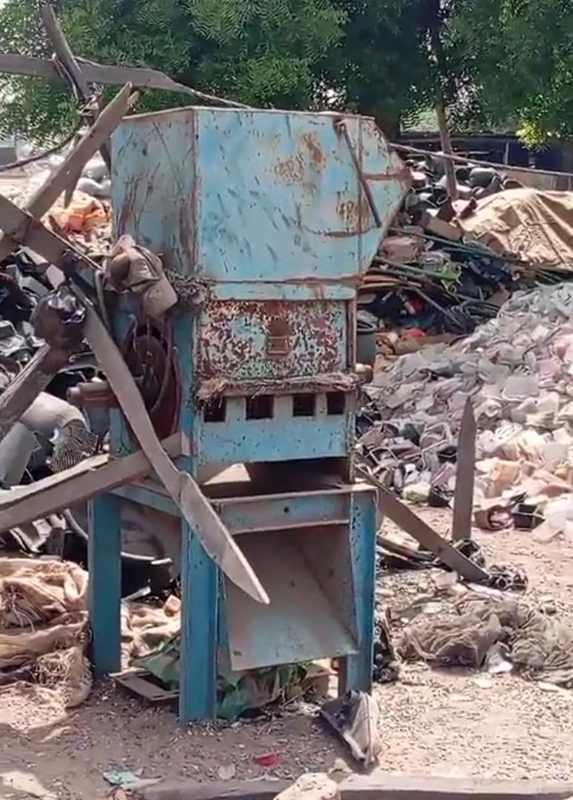 rundown outdoor area filled with various objects. In the center stands an old, rusty machine painted in light blue. Debris and miscellaneous items surround it, including tires, buckets, bags, and pieces of wood. A large pile of garbage, consisting mostly of white plastic bottles, is visible in the background, partly covered by a tan sheet. A large green tree stands in the upper background. The ground is dirt and littered with trash. The overall impression is of a cluttered and perhaps neglected workspace.