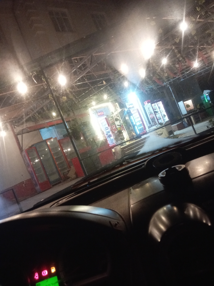 A night scene viewed from inside a car. The dashboard and steering wheel are prominent in the foreground. Through the windshield, a store is visible, illuminated by bright lights. The store has several vending machines and open signs. Overhead, numerous string lights add to the brightness. Above the store, a building with visible windows can be seen. The overall scene suggests a late-night stop.