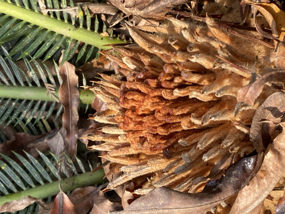 This image presents a close-up, ground-level view of a botanical subject in the city of Achara, Nigeria. The central feature is a roughly circular, dense cluster of plant growth, appearing as a forming cone or emerging fronds. Its core consists of numerous tightly packed, upward-pointing, reddish-brown, elongated structures with a slightly shiny or resinous appearance. Radiating outwards from this core are lighter brown, fuzzy, scaly structures, also pointed, forming an outer layer. The ground immediately surrounding this growth is covered with several dry, brown, curled leaves of varying sizes. In the background, out of focus, are multiple vertical green stems and sections of green, segmented fronds, indicative of larger plant life such as a cycad or palm. The scene is brightly lit by direct sunlight, casting subtle shadows and highlighting the textures of the plant material and leaves. No human or animal subjects are present.