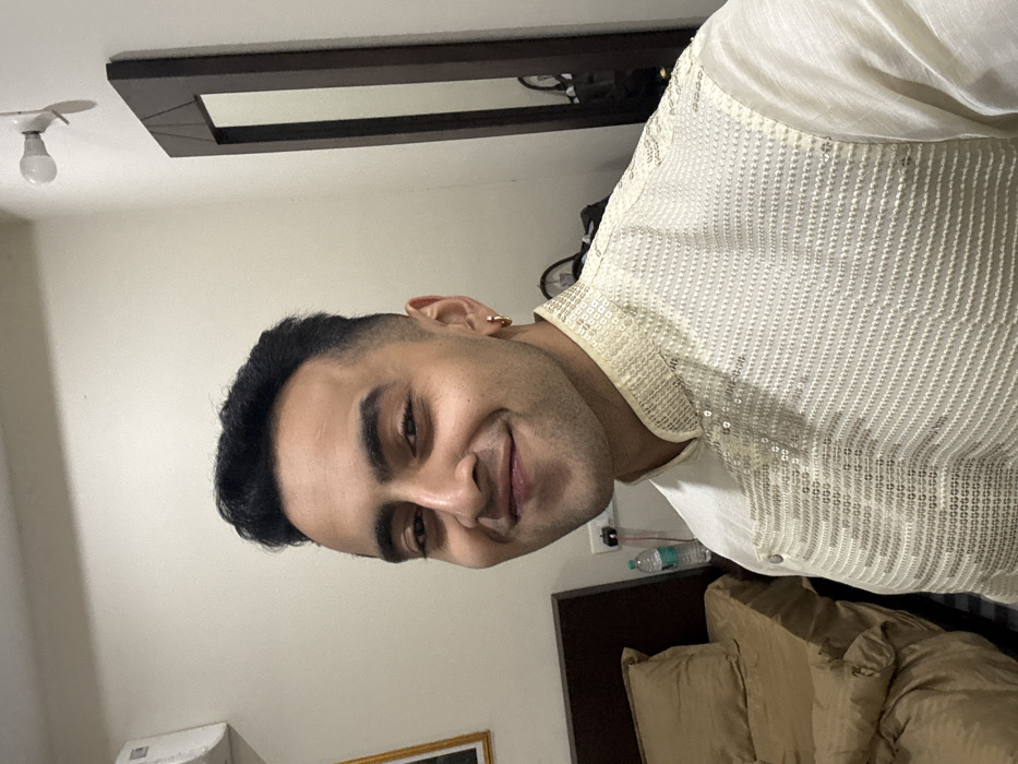 A person with dark hair smiles slightly at the camera. They wear a light-colored shirt or tunic with sequins or decorative embellishments. A gold earring is visible in their left ear. The background includes a cream-colored wall, a dark-framed mirror or artwork above, and the edge of a bed with neutral-toned bedding. A small light fixture is on the ceiling. A water bottle and electrical outlet are visible near the bed.