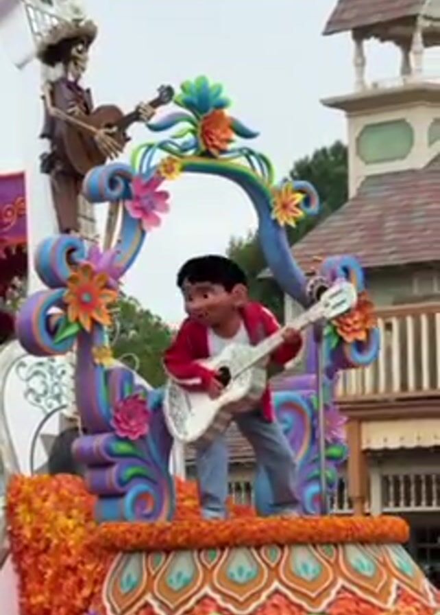 A parade float decorated with marigolds and other flowers features a representation of the Disney Pixar movie "Coco." A skeleton figure plays guitar at the top. A child-sized animatronic figure, dressed as Miguel, holds a white guitar and moves along to the music. The background includes buildings in a light, Western-style. The sound is upbeat pop music with audience cheers.