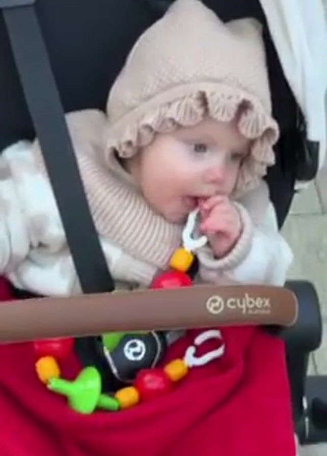 A baby sits in a black Cybex stroller, secured by black straps. The baby wears a beige knitted hat with a ruffled edge and a matching knitted collar. They are dressed in a white and beige patterned outfit and are sucking on a colorful teething ring with red, yellow, and green elements. A red blanket is draped over the stroller's safety bar. The stroller is being pushed along a sidewalk. The background is blurred.