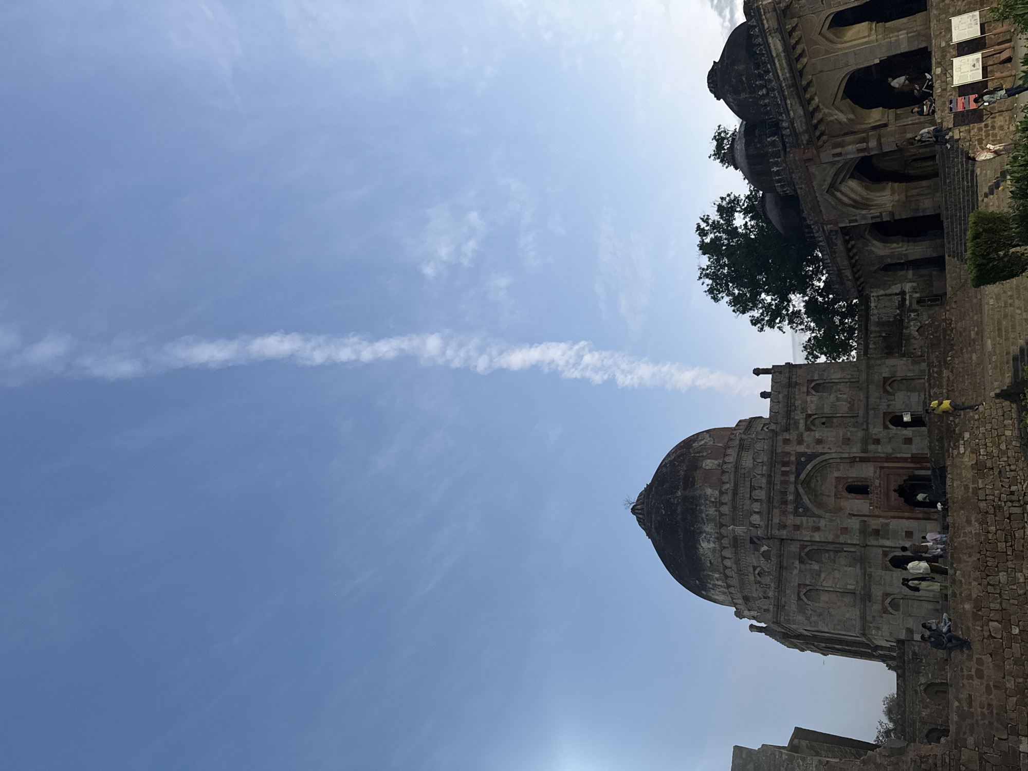 This vertical-format image captures a daytime scene at Lodhi Garden, New Delhi, India. The dominant subject is the Tomb of Mohammed Shah Sayyid, a large, weathered stone structure with a prominent dark dome and an octagonal base, occupying the left and central portions of the frame. Its facade displays intricate stonework and multiple arched entryways. To the right, a second stone structure, identifiable as a mosque, features multiple smaller domes and arched porticos, partially veiled by dark green foliage. The immediate foreground consists of rugged stone walls and steps leading up to the main structures. Approximately 15-20 individuals are observed throughout the scene. Several people are seated or standing on the stone platforms at the base of the tomb, with others visible within the arched recesses of the adjacent mosque. One individual in a yellow shirt is seen ascending a low stone wall on the far right. The sky, a clear medium blue, exhibits scattered thin white clouds and a distinct, vertically oriented white contrail extending from the upper left towards the lower right. Natural light illuminates the scene, with a subtle lens flare present in the upper left quadrant. No overt interactions or dramatic actions are discernable among the individuals.