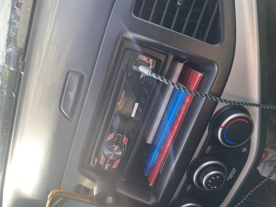 The image presents the interior of a vehicle, specifically the dashboard area, viewed from a front occupant's perspective. The scene occurs during daylight hours on a roadway in or near Seclin, France. Intense sunlight creates significant glare across the dashboard and through the front windshield. The dashboard is dark gray and textured. A red triangular hazard light button is centered on the upper portion of the dash. Below this, a Pioneer car stereo unit is integrated, featuring a silver-colored rotary knob, red-backlit buttons, and a display partially obscured by sun glare and a white sticker or cover. A black and gray braided audio cable is plugged into the auxiliary input port located on the right side of the stereo. Directly beneath the stereo, a storage compartment holds several stacked items: a blue object (possibly a book or folder) on top, followed by a white or light-colored object, and a red object at the bottom. To the right of this compartment, a vertical air vent grille is visible. Further down the dashboard, two rotary climate control knobs are present. The left knob displays settings 0-4 and the label "PASSENGER AIR BAG," indicating fan speed control. The right knob features blue and red segments, signifying temperature control. On the far left, a black cylindrical phone mount grips a smartphone enclosed in an orange protective case. Through the vehicle's windshield, a multi-lane road or highway is visible, with multiple vehicles in the distance, including a prominent silver or light blue sedan. The vehicle from which the image was captured is in motion.