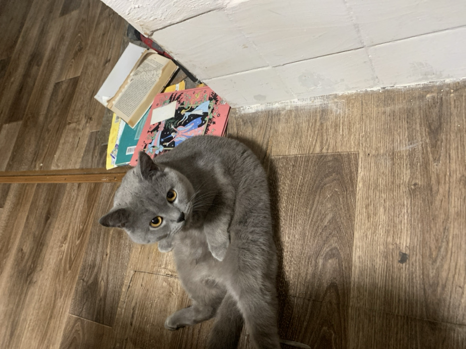 A gray cat lies curled on a brown wooden floor, beside a stack of books against a white wall. The cat has yellow eyes and looks up at the camera. The books have various colored covers, including a pink one with a white label and illustrations, and an old, open book with yellowed pages. The wooden floor has a distinct grain pattern running lengthwise. The wall is white with a textured surface.