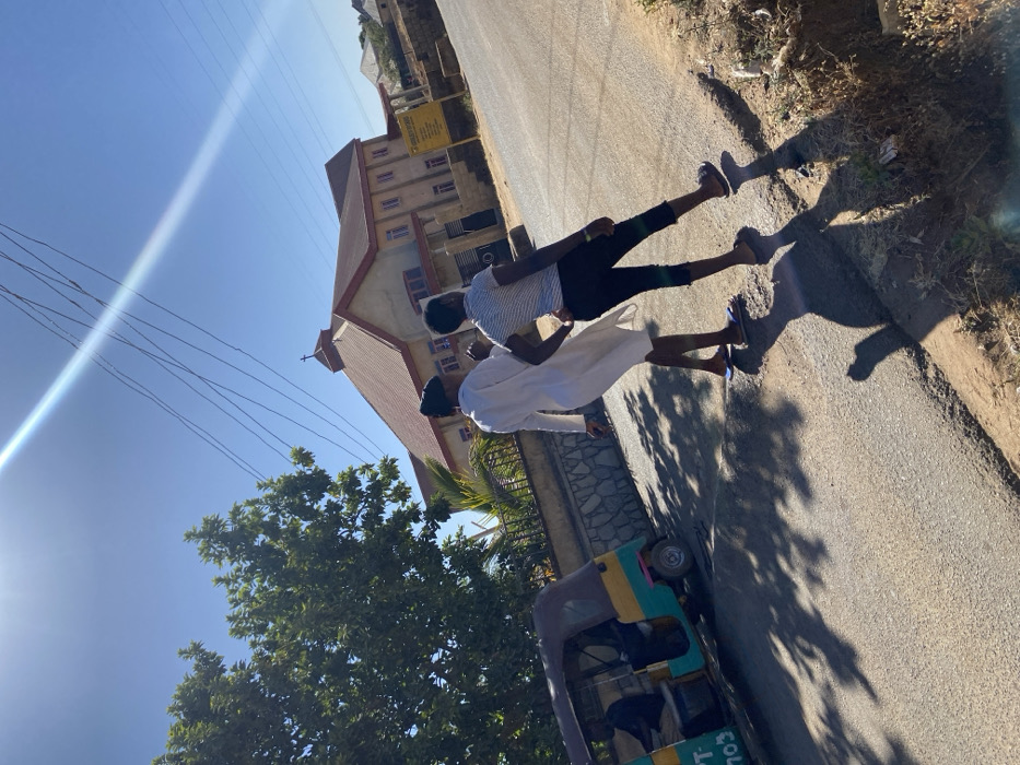 The image displays an outdoor street scene in Barakin Akawo, Nigeria, under a bright, clear blue sky with a prominent sun flare in the upper right. Two individuals are observed from behind, walking away from the camera on the right side of a paved road. The individual on the left wears a light-colored, long-sleeved garment, a dark head covering, and light blue flip-flops. The individual on the right wears a horizontal striped short-sleeve top, dark capri-length pants, and dark flip-flops, with their left hand on their hip. Both cast elongated shadows to their right. On the left side of the road, a three-wheeled auto-rickshaw, green, yellow, and brown in color, is visible. A person is seated in the driver's position. Partial text reading "PT" and "703" is visible on the side of the vehicle. In the background, a multi-story building with a light-colored facade, a reddish-brown roof, and a steeple featuring a cross at its apex is prominent, indicating a church. A yellow sign stands to the right of the church's property line. A large green tree is on the far left, behind a low stone wall. Multiple dark utility wires traverse the sky from the upper left to the upper right. The road edge on the right shows minor dirt and sparse vegetation.