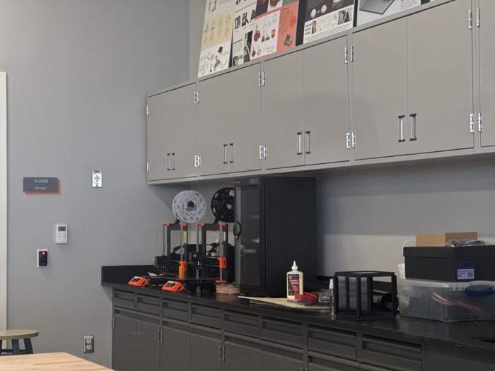 gray-walled room with cabinets above a dark countertop. On the countertop are several 3D printers, spools of filament, and various supplies like glue, boxes, and tools. A black cabinet is situated between the printers and other supplies. The wall features a room number plaque "11-2350 Storage," a light switch, and a keycard reader. A wooden table with a stool sits in the foreground.