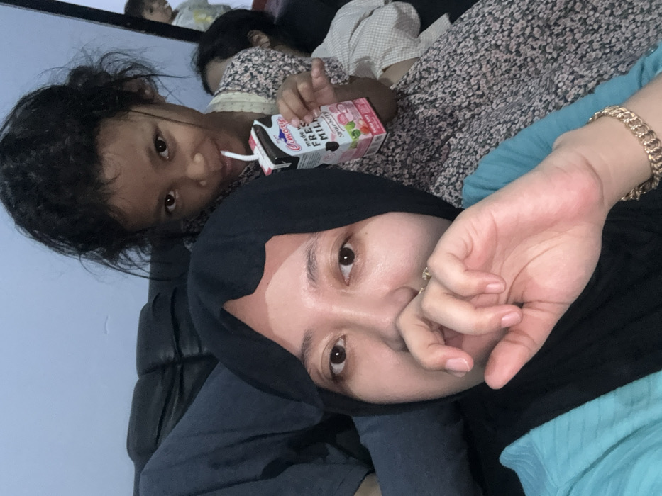 A multi-person indoor scene in Kebonsari, Indonesia. In the foreground, an adult female with fair skin, wearing a black hijab and a turquoise top, looks directly at the camera. Her right hand is raised with fingers curled towards her chin, displaying a gold-toned ring on her ring finger. A gold-colored chain bracelet is visible on her left wrist. Behind and to her right, a young girl with dark, disheveled hair drinks from a "Cimory made with FRESH MILK Strawberry" carton via a straw, also looking at the camera. The child wears a floral patterned dress. Partially visible behind the child is another individual, possibly an adult, with dark hair, wearing a light-colored, checkered or plaid top, appearing to recline. In the distant background, a very blurry child is standing. A dark-colored sofa backrest is visible behind the foreground figures, against a light blue wall.